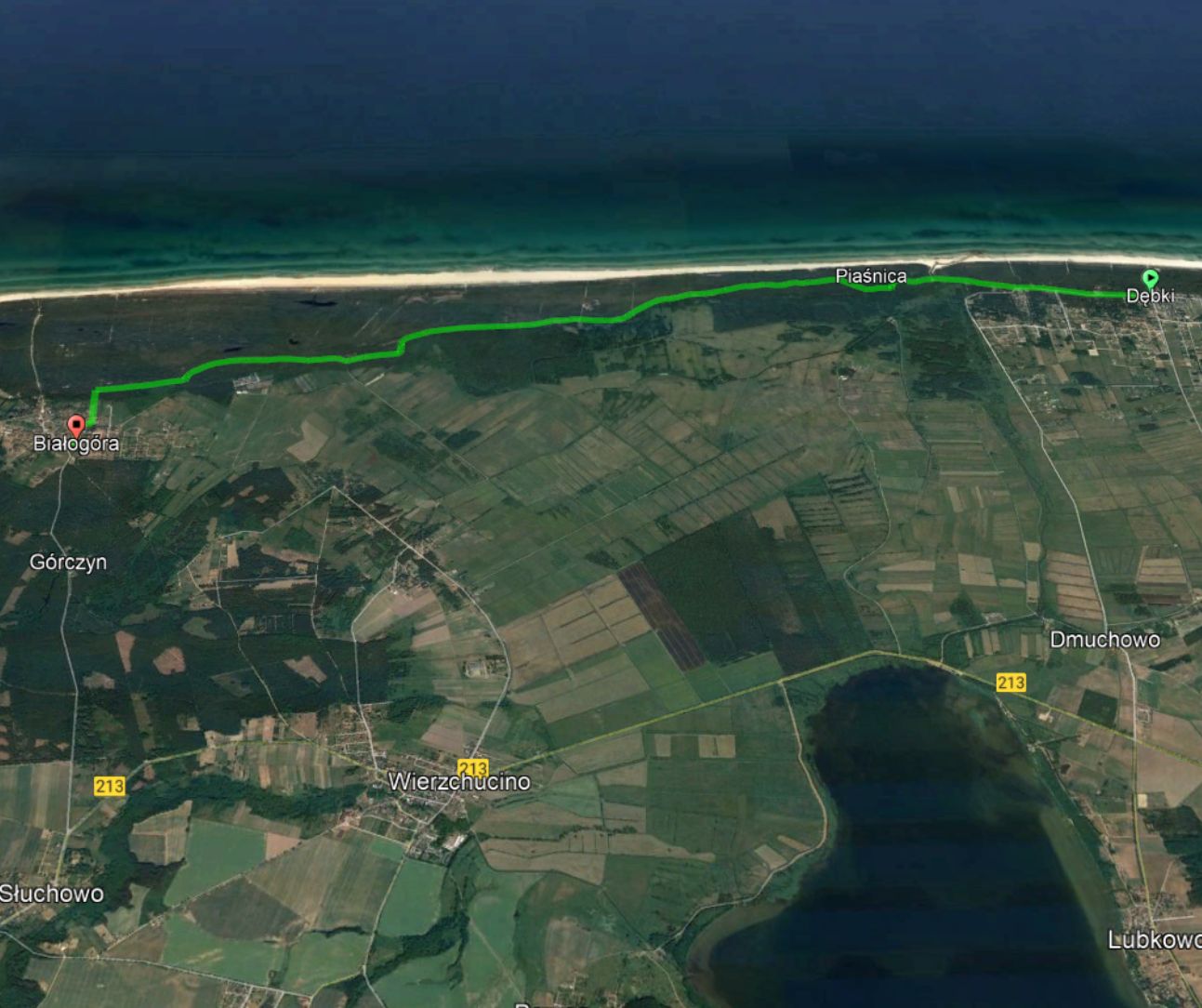 Mapa trasy Dębki - Białogóra. Zobaczcie jak odchodzi ona od morza w kierunku Białogóry.